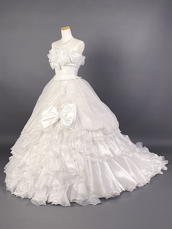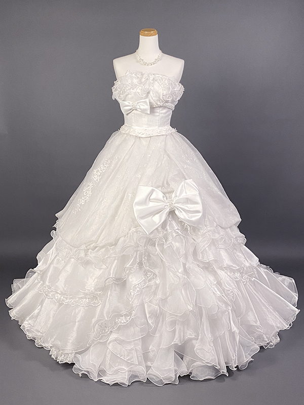 ふんわりと広がるボリューム感のあるスカートは、華やかで可憐さを際立たせます。上品で可愛らしい存在感をはなつ、フリルたっぷりのプリンセスラインドレスは、胸元とウエストのリボンが愛らしさを添え、華やかなボリューム感で花嫁の可憐さを際立たせます。