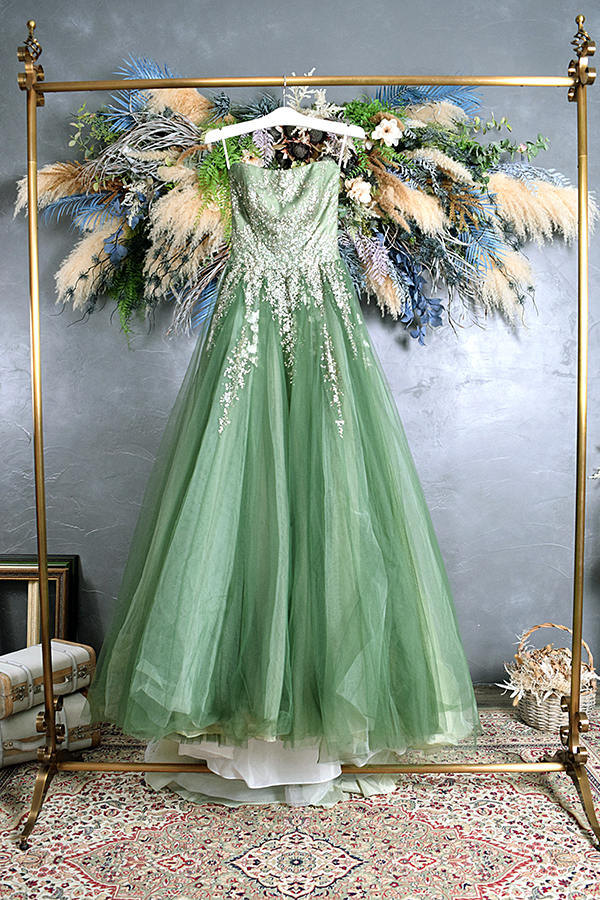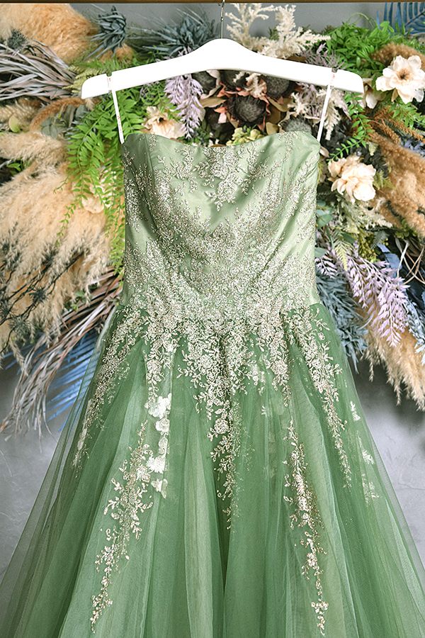 ウエディングドレスを大量入荷した為、取り急ぎ仮で写真を掲載します。こちらのグリーン系ドレスは、柔らかなチュールが幾重にも重なり、ナチュラルでありながらも華やかさを演出してくれる一着です。施された刺繍とビジューが、動くたびにきらめきを放ちます