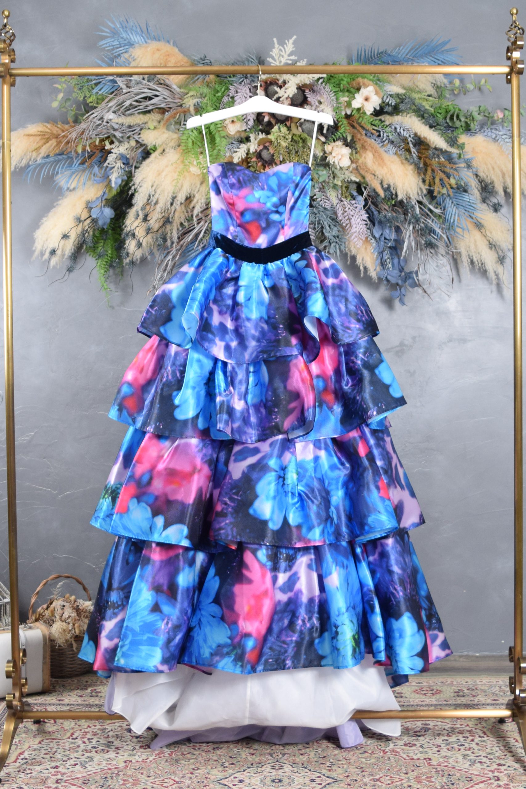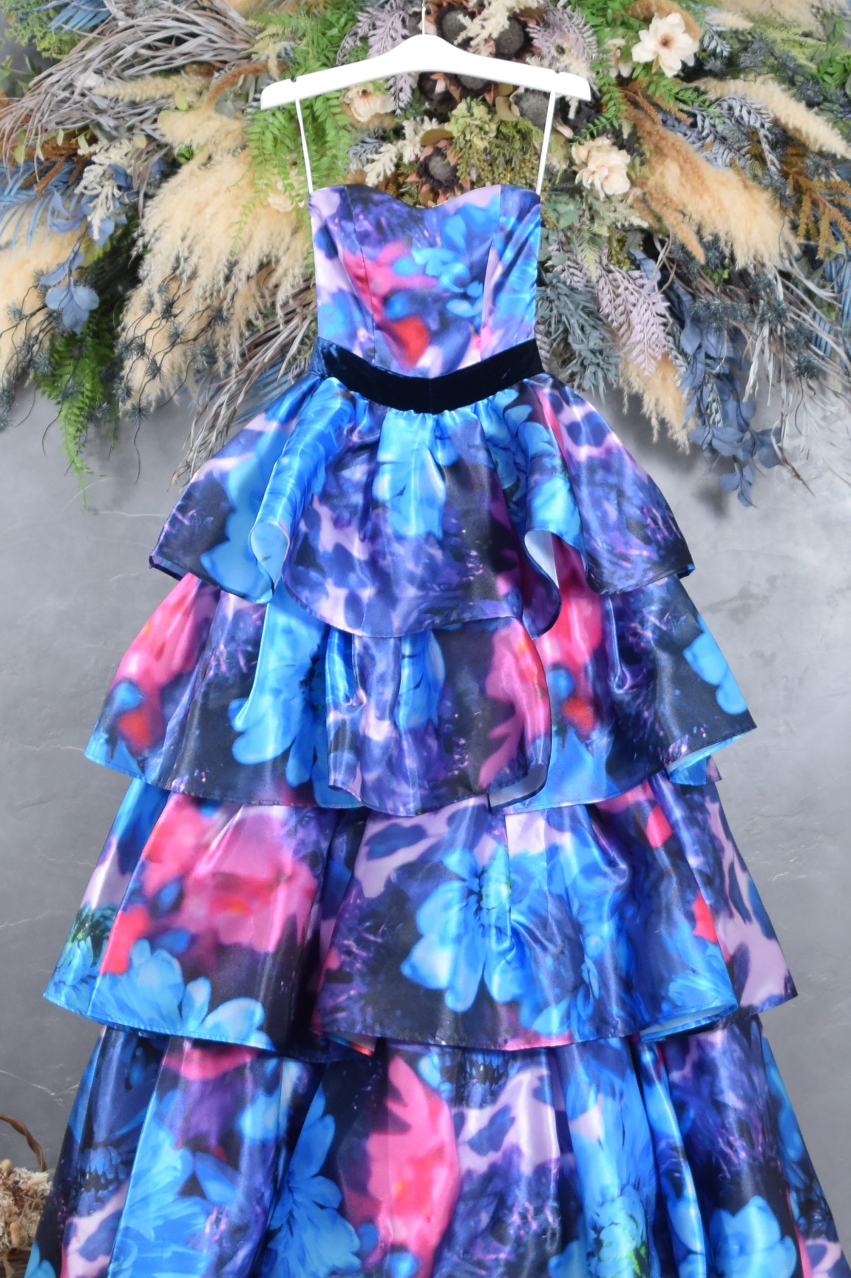 華やかなブルーとピンクのグラデーションが美しく溶け合う、フラワープリントドレス。光の角度で表情を変える立体的なティアードデザインが印象的です。まるで花々に包まれたようなドラマティックな一着。映え間違い無しの華やかさで、前撮りにピッタリです。