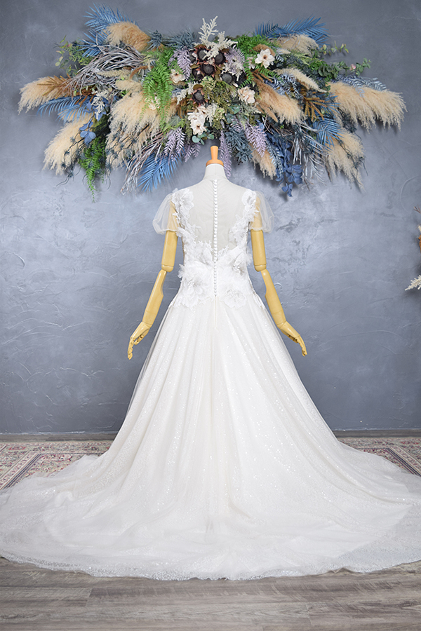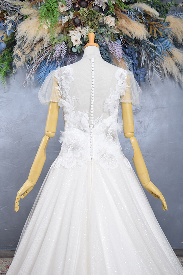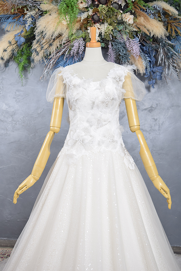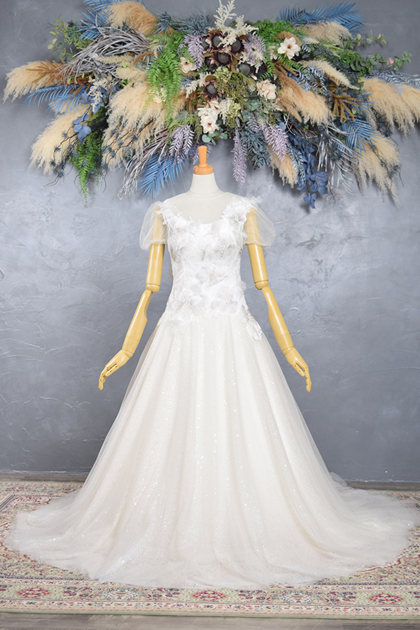 このドレスは、やわらかなオーガンジーの質感と繊細なレースの重なりが美しい、透明感あふれるAラインドレス。肩のチュールスリーブが愛らしさを添え、ナチュラルで清楚な印象に仕上げます。動くたびに光を柔らかく反射し、花嫁を優しく包み込むような1着。