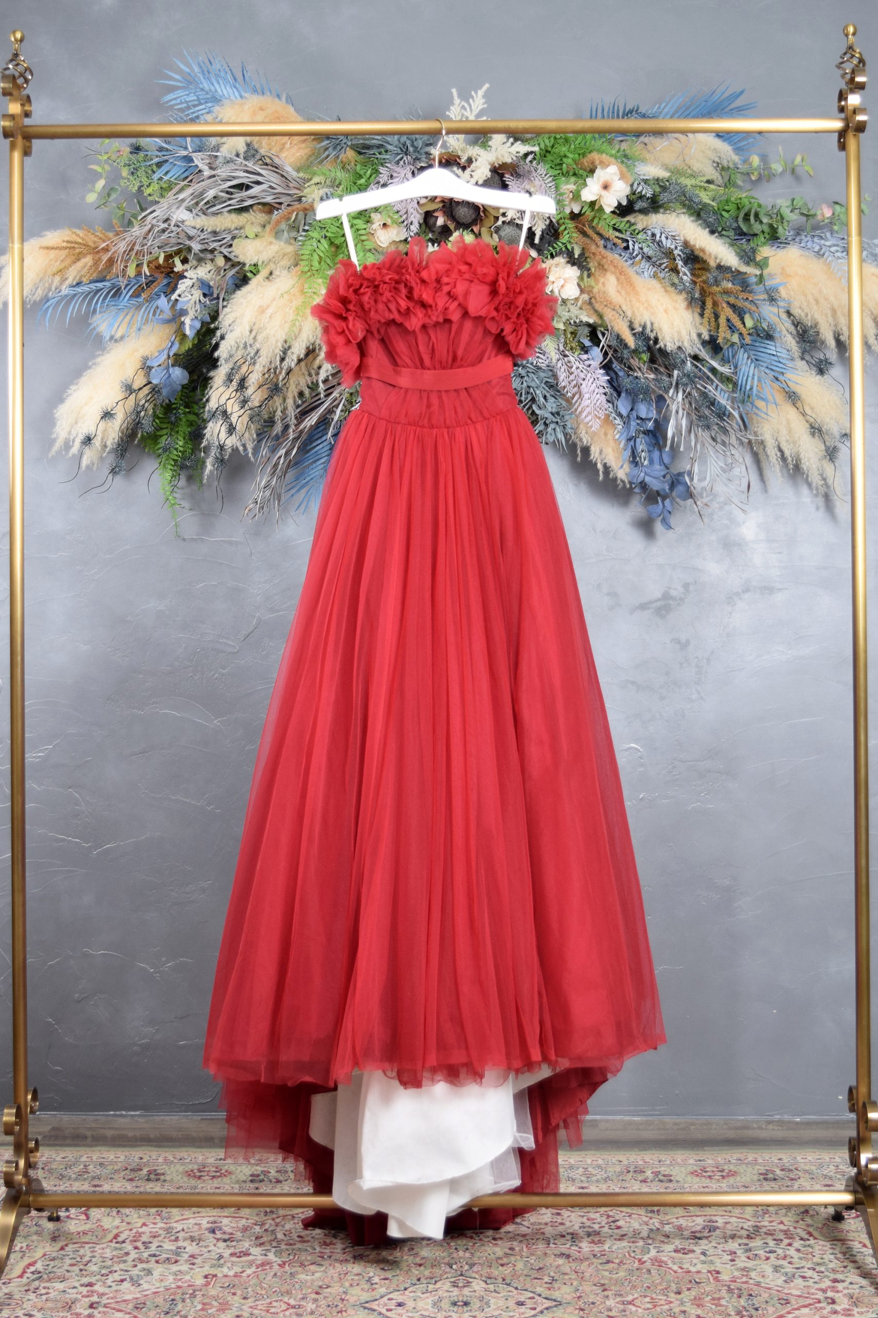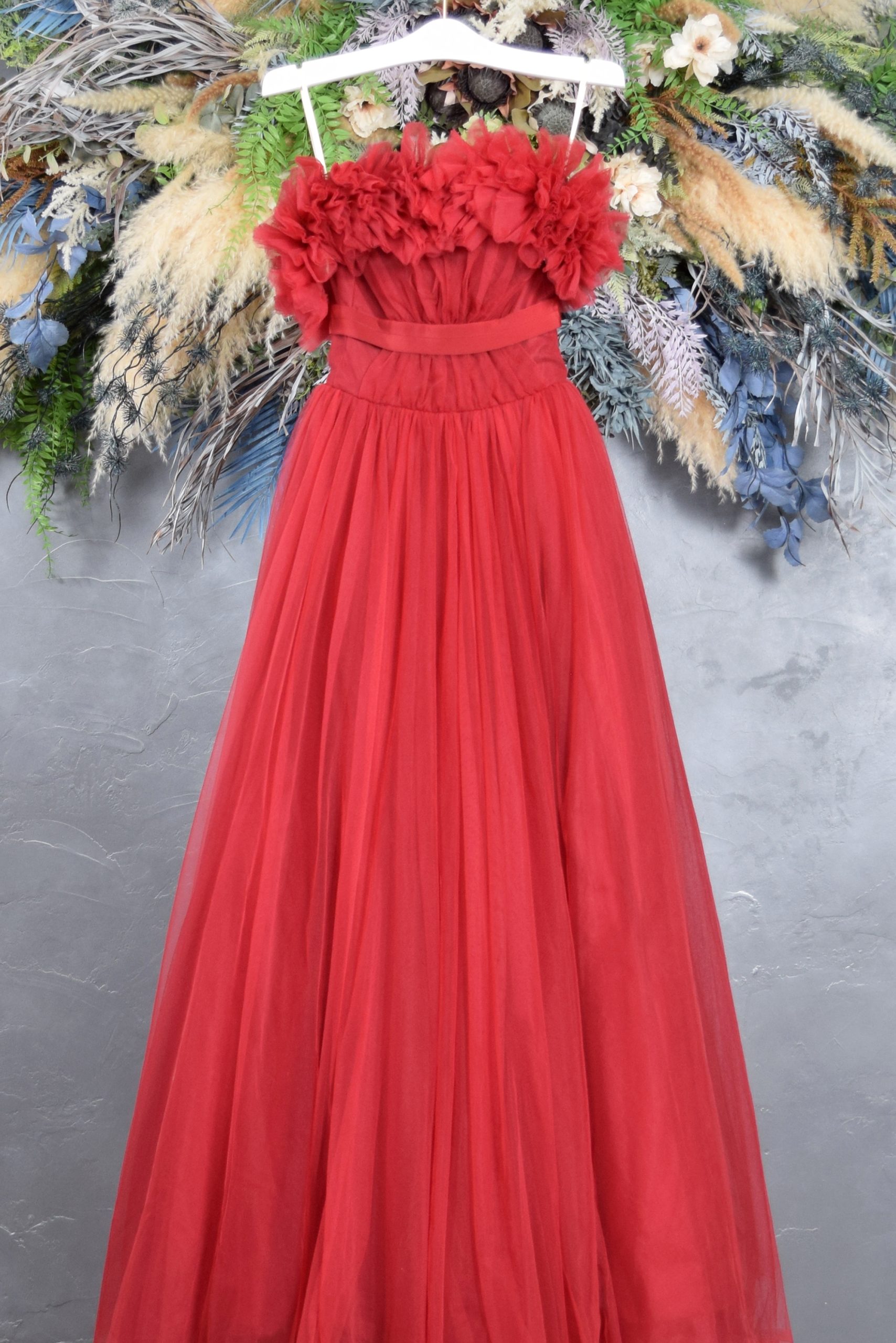 胸元にあしらわれた立体フラワーモチーフが印象的な、華やかでロマンティックなレッドドレス。柔らかいチュール素材が重なり、動くたびにふんわりと揺れるシルエットが優雅な存在感を放ちます。鮮やかな赤色が肌を美しく見せ、ロケーション撮影でも映える一着