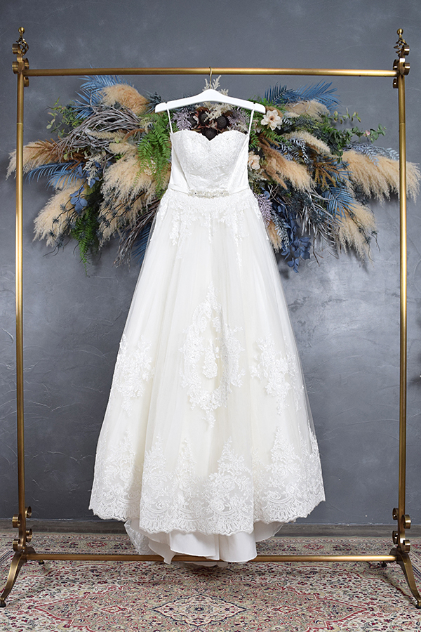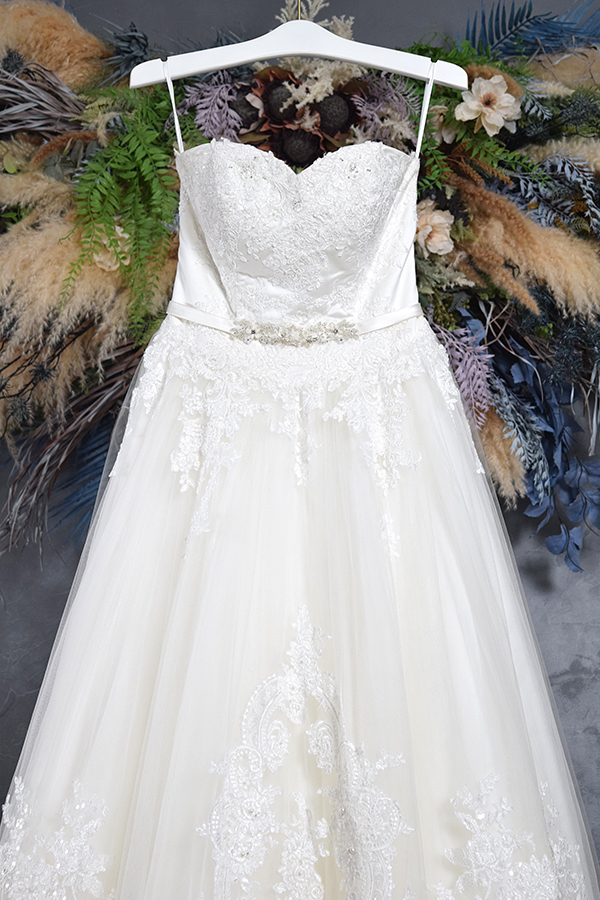 ウエディングドレスを大量入荷した為、取り急ぎ仮で写真を掲載します。光沢感ある生地と繊細なレース刺繍が調和した、気品あふれるウェディングドレス。ハートカットがデコルテを美しく引き立て、スカートに広がるレース模様が花嫁の歩みに優雅さを添えます。