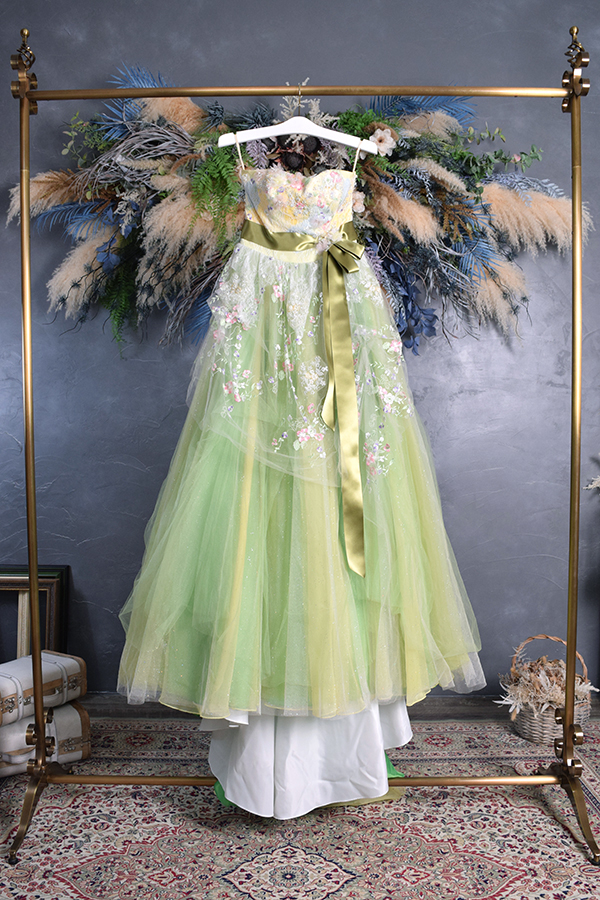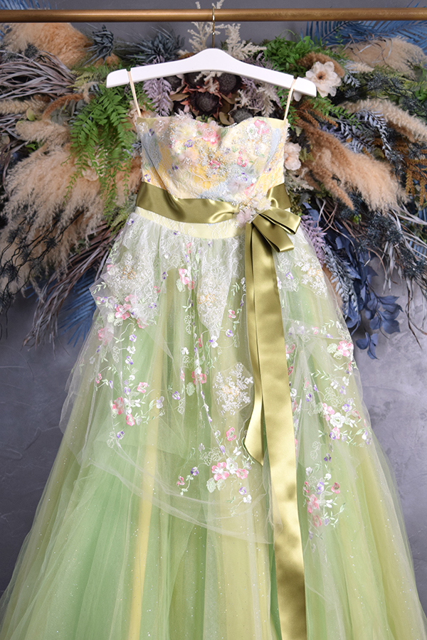 カラードレスを大量入荷した為、取り急ぎ仮で写真を掲載します。爽やかなグリーンに柔らかなイエローを重ねた、軽やかな雰囲気のカラードレスです。胸元から広がる花刺繍とリボンベルトが愛らしさを引き立て、ナチュラルな華やかさを演出し美しく輝かせます。