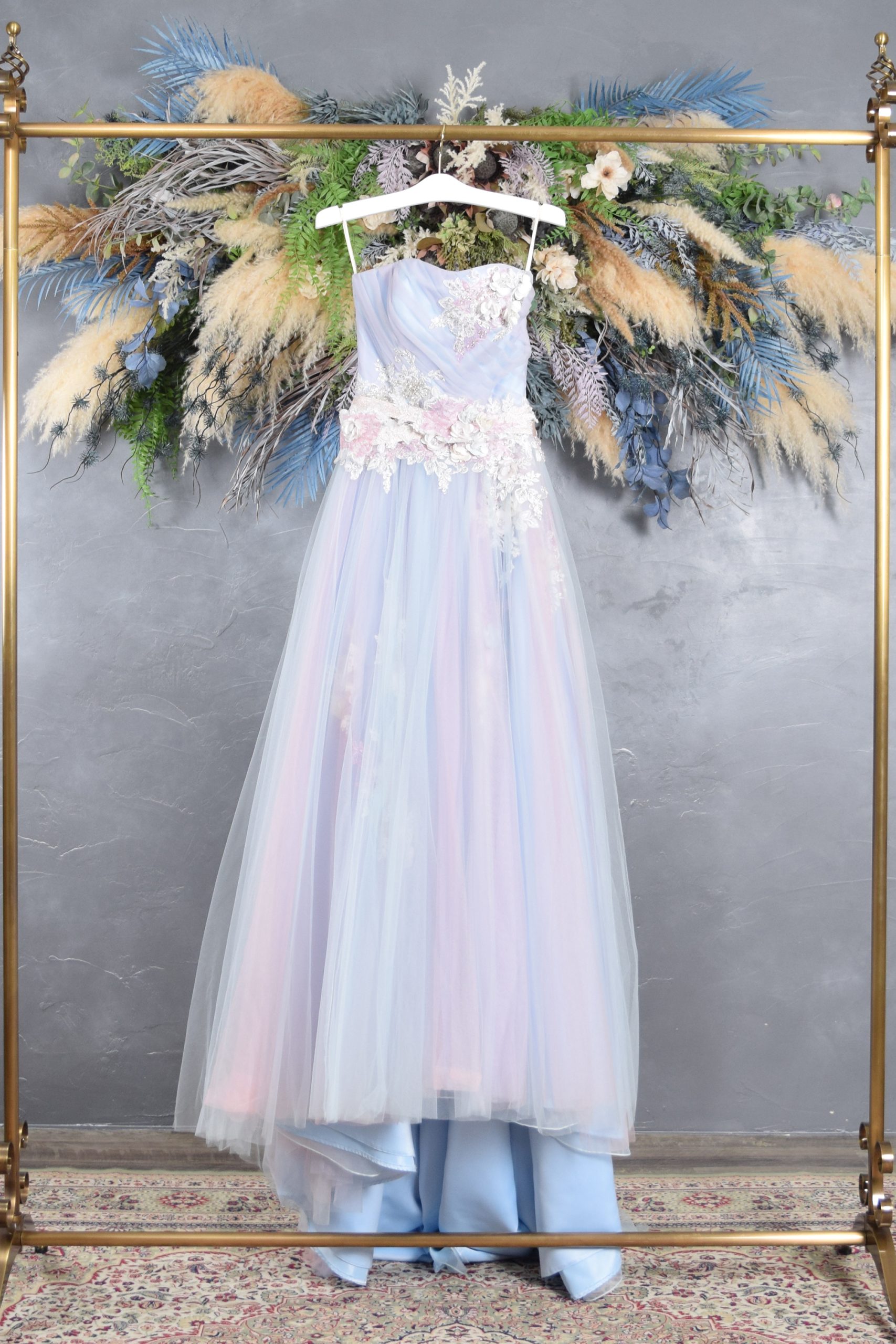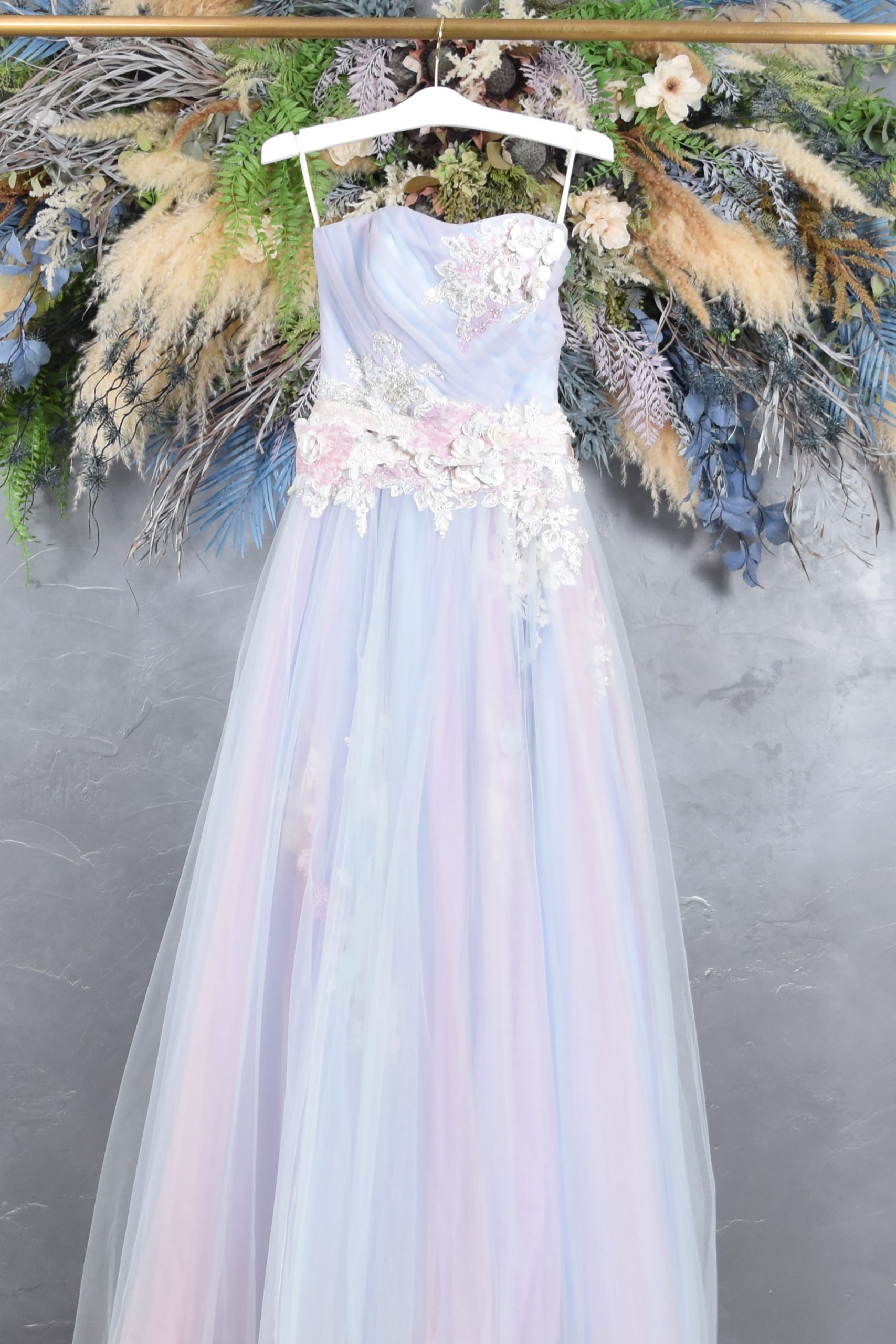 淡いパープルとピンクのグラデーションチュールが美しいAラインシルエット。胸元の立体的な刺繍とビジュー装飾が光を受けて輝き、優雅でロマンティックな印象を演出します。サテンリボンがウエストをすっきりと見せ、クラシカルで華やかさを添える一着です。