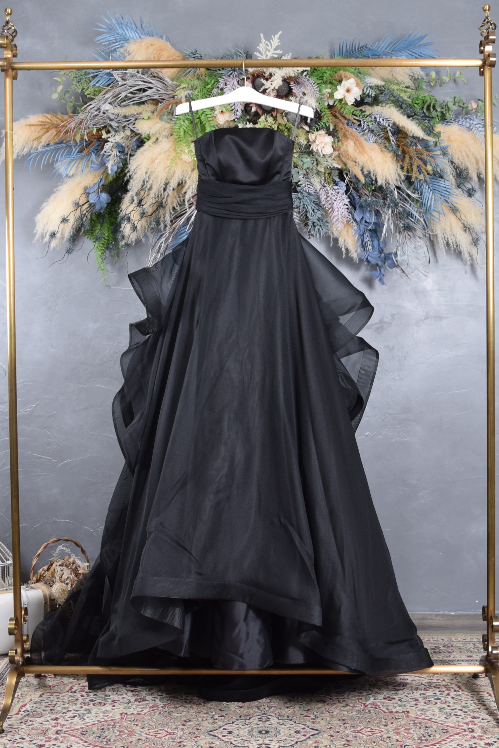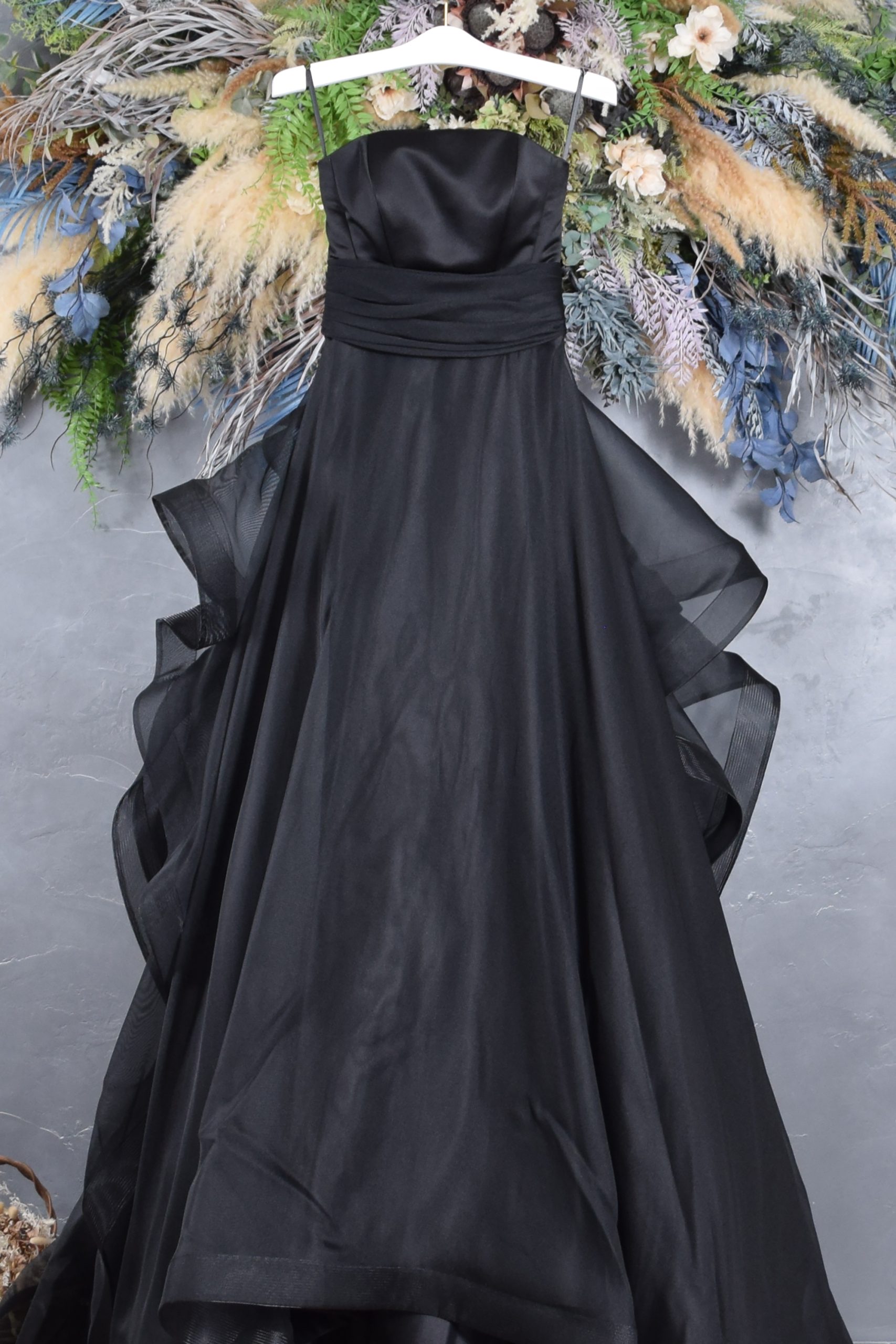 漆黒の美しさが際立つエレガントなブラックドレス。光沢のあるオーガンジー素材が動くたびに柔らかく揺れ、シルエットに奥行きをプラス。ウエストラインをすっきり見せるデザインで、スタイルアップ効果も抜群。クラシカルでモードな雰囲気を演出したい花嫁様におすすめの一着です。