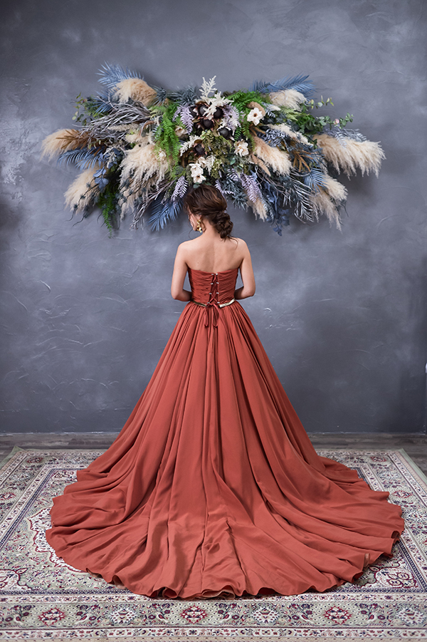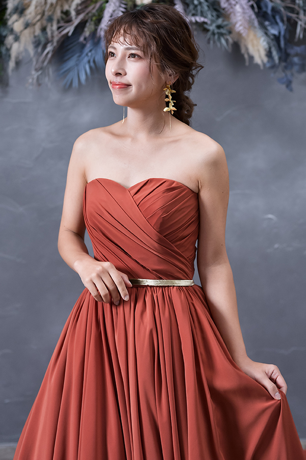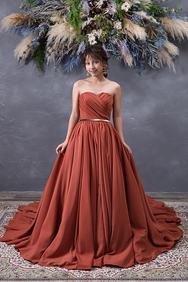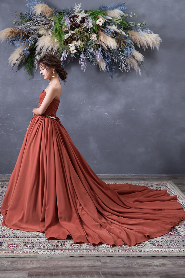 温かみのあるテラコッタカラーのカラードレス。シンプルながらも美しいドレープが上品な印象を演出し、胸元のクロスデザインが洗練されたアクセントに。ナチュラルで大人の魅力あふれる一着です。